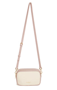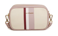 This stylish and functional bag is crafted with a unique combination of materials and features a bold striped band design. With two compartments, an internal pocket, and an adjustable strap, it's perfect for keeping your essentials organized and within reach. Available in two striking colorways: Navy/Cream with red and white stripes, or Pink/Cream with white and fig stripes. A matching Tote is available for a complete set.