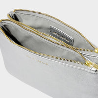 Elevate your day-to-night wardrobe with our Duo Pouch in Silver, designed for both style and functionality. Featuring a dual-zip closure and multiple compartments, this pouch offers effortless organization with a sleek, modern touch. The discreet D-ring allows you to instantly convert it into a crossbody bag by attaching one of Katie Loxton's interchangeable bag straps, making it as versatile as it is chic.