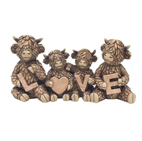 Expertly crafted from durable resin, this freestanding figurine showcases a family of adorable Highland cows, each holding a letter that together spells out the word LOVE. Their tufty, hand-painted coats in shades of brown are finished with a rustic matt effect, bringing a natural and homely feel to your décor.